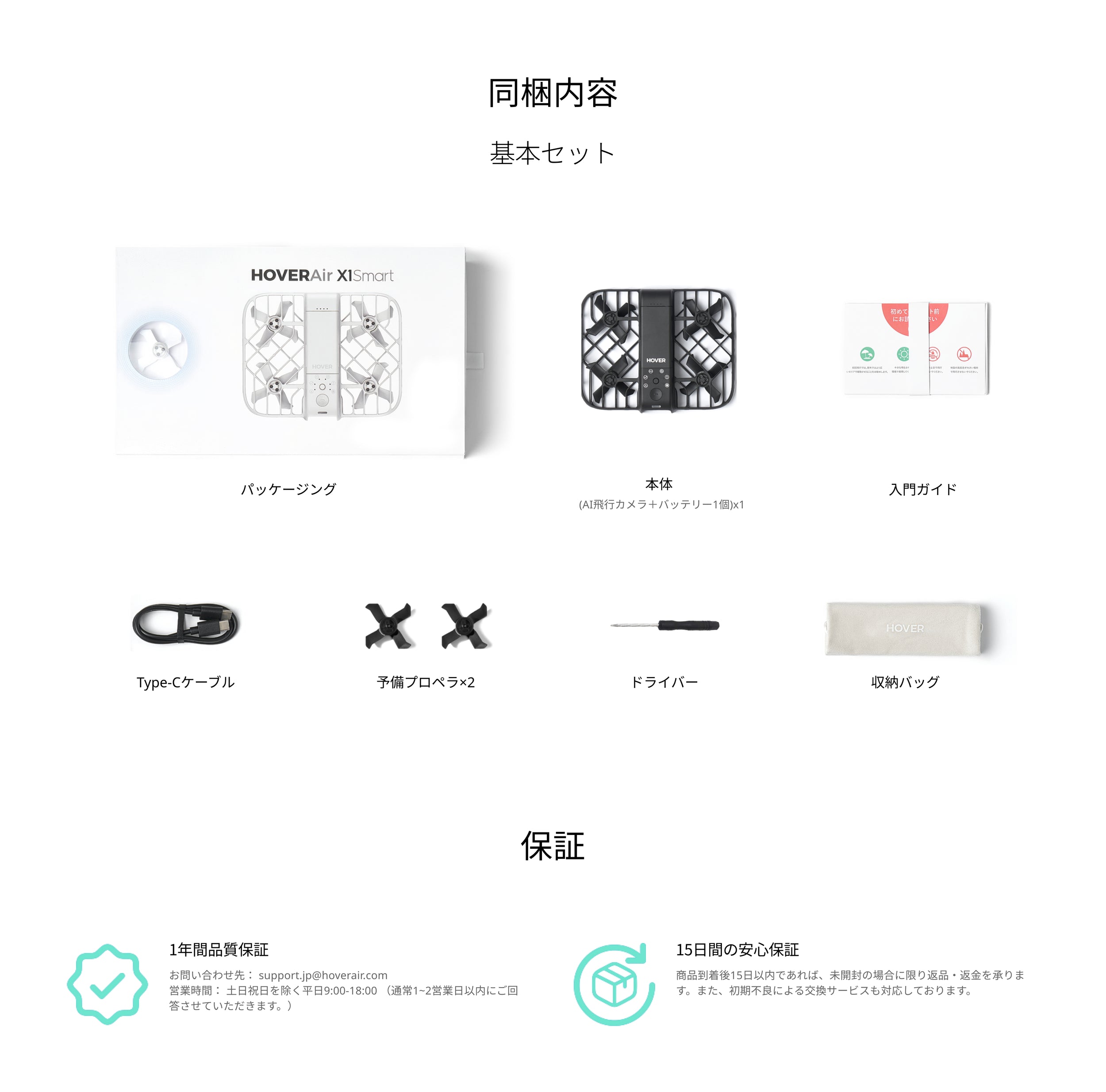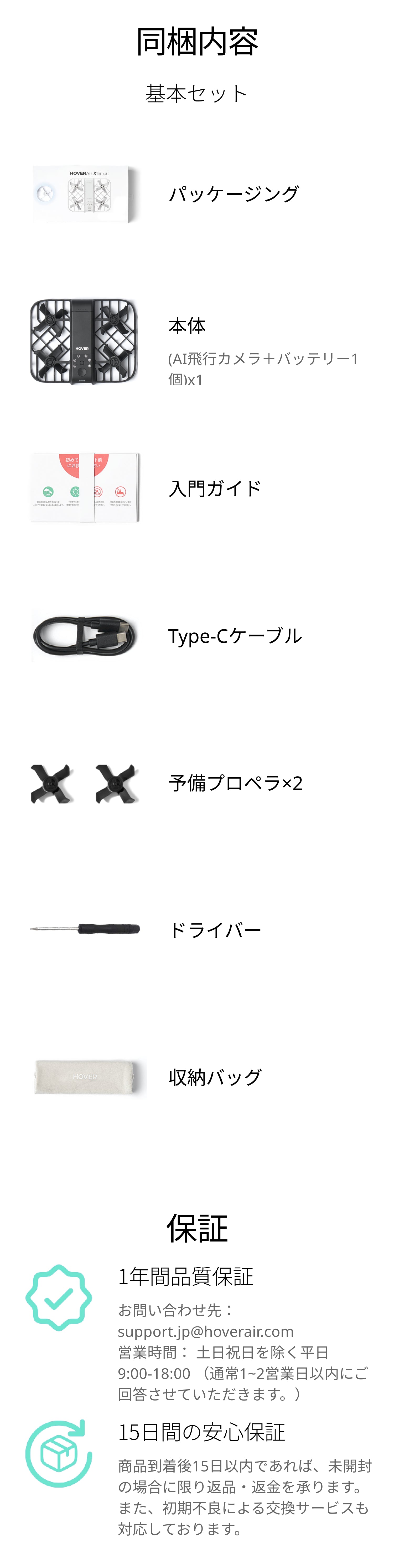 バッテリーケア(無料) HOVERAir独自の保証 手厚く対応で信頼のサポート品質 19,999円以上のご注文で送料無料 2営業日以内に発送 15日間無料返品保証 1年間品質保証